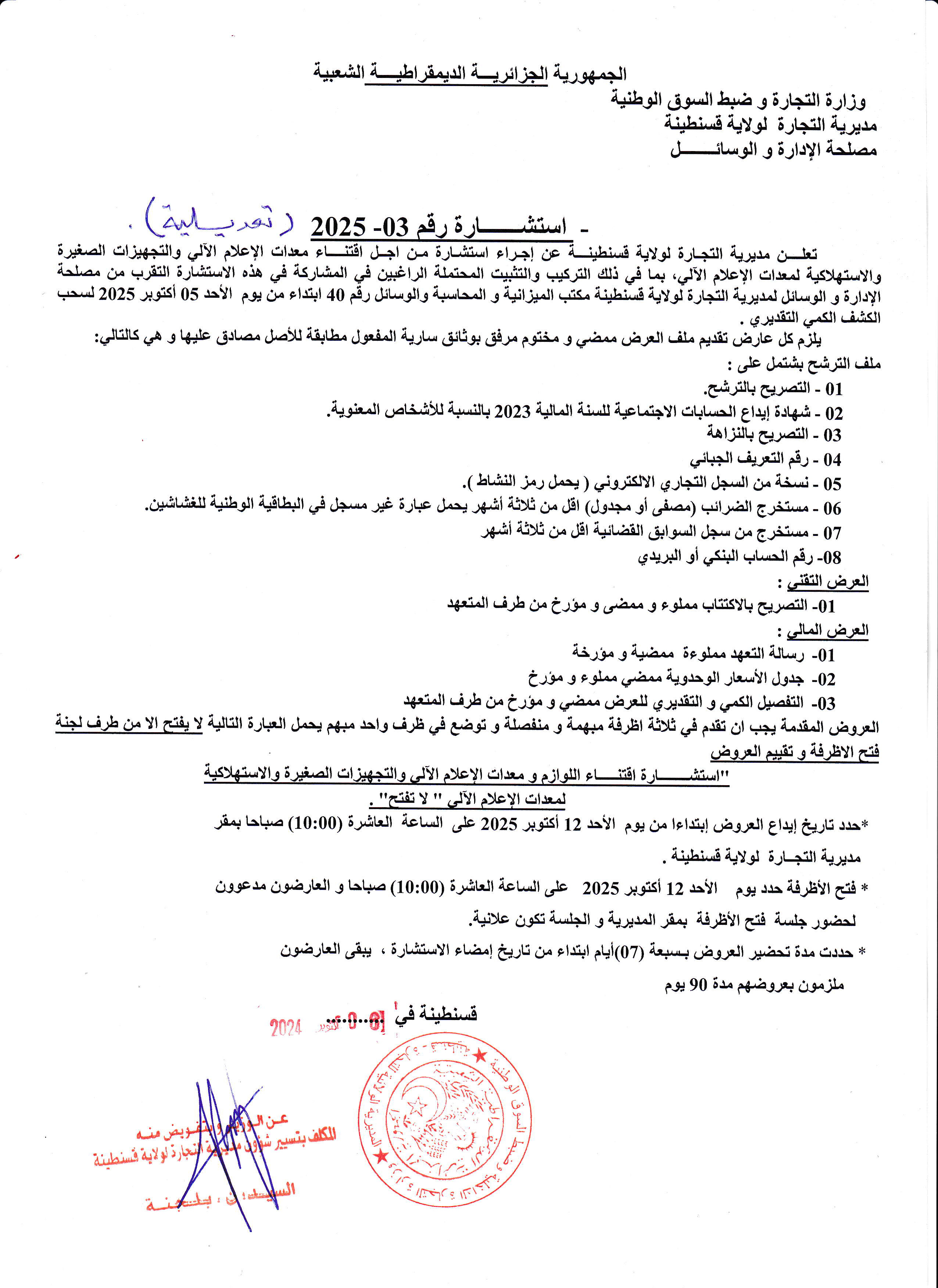 وعليه تنهي مديرية التجارة و ترقية الصادرات لولاية قسنطينة إلى علم كافة المنتجين والمصدرين والمؤسسات الراغبة في المشاركة تأكيد مشاركتها بملأ الاستمارة المرفقة وموافاتنا بها عبر: